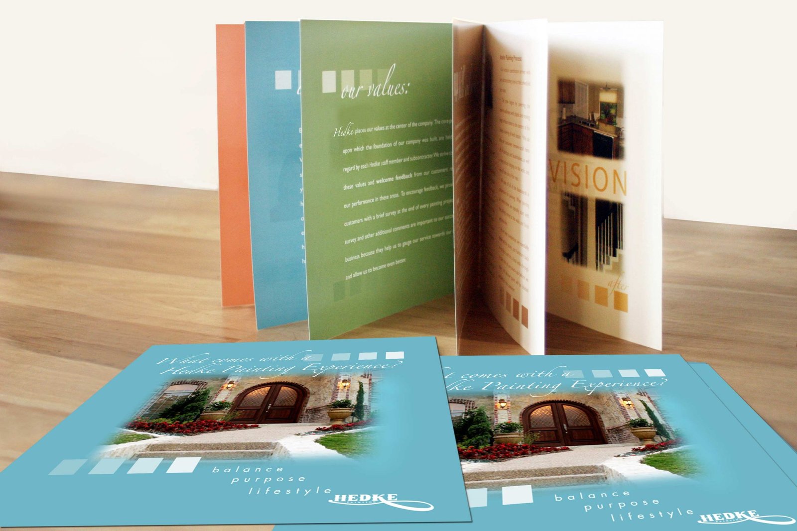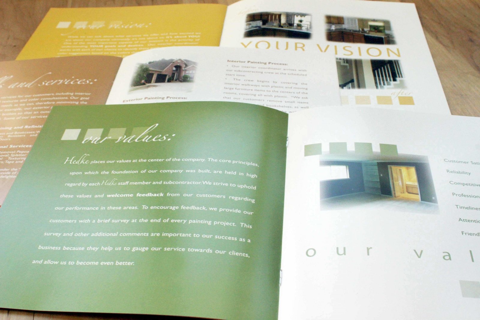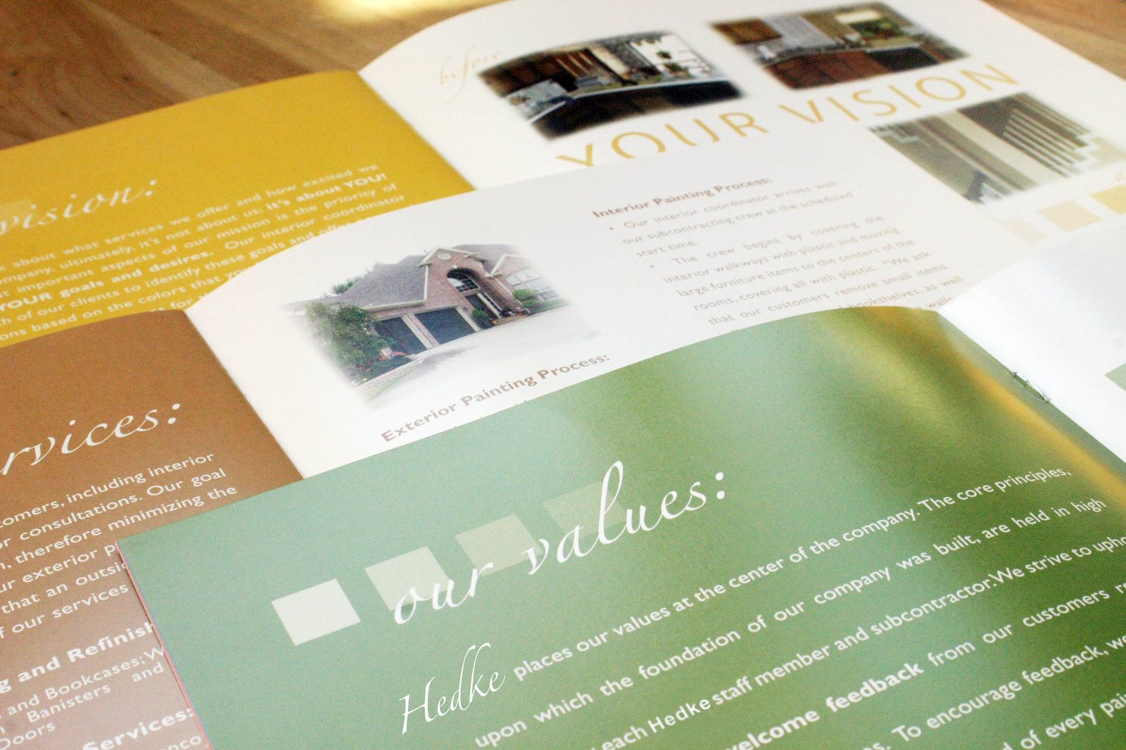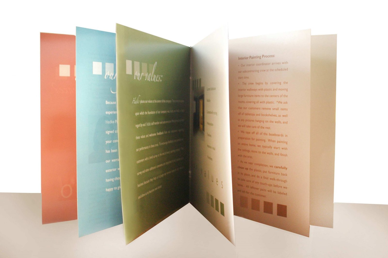 The colors used for the cover and the pages in this brochure design are some of the most popular wall paint colors this painting company sells. We chose to use those colors for the colors for the pages so the painting company would have a marketing tool to use to sell those colors to their clients. The squares on the pages include color swatch variations for the different featured wall paint colors.