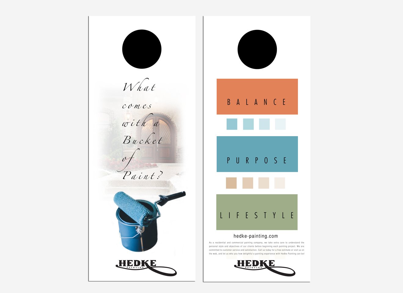 We created an advertising campaign for this company with a question and answer. The question is, “What comes with a bucket of paint?” The answer is “balance, purpose, lifestyle.” The concept behind the answer comes from the study behind the moods that colors evoke. This painting company has studied that science, and suggests painting colors for room that will enhance the function of the room. For example, a room where you are productive, needs colors that are associated with productivity. A room that is designed for sleep, needs colors that are calming. The advertising campaign was designed to communicate the message that when you hire this painting company, you are not just getting a painting company, but a lifestyle consultant, and that their product will improve the quality of your life. The advertising campaign also implies that their “bucket of paint” is so much more valuable than what you would get from other painting companies because of the expertise that comes with it.