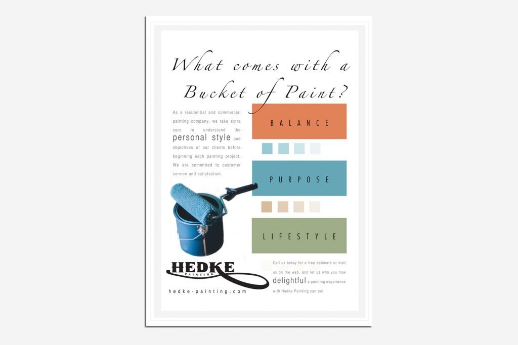 We created an advertising campaign for this company with a question and answer. The question is, “What comes with a bucket of paint?” The answer is “balance, purpose, lifestyle.” The concept behind the answer comes from the study behind the moods that colors evoke. This painting company has studied that science, and suggests painting colors for room that will enhance the function of the room. For example, a room where you are productive, needs colors that are associated with productivity. A room that is designed for sleep, needs colors that are calming. The advertising campaign was designed to communicate the message that when you hire this painting company, you are not just getting a painting company, but a lifestyle consultant, and that their product will improve the quality of your life. The advertising campaign also implies that their “bucket of paint” is so much more valuable than what you would get from other painting companies because of the expertise that comes with it.