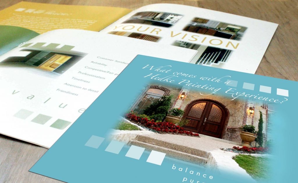 The colors used for the cover and the pages in this brochure design are some of the most popular wall paint colors this painting company sells. We chose to use those colors for the colors for the pages so the painting company would have a marketing tool to use to sell those colors to their clients. The squares on the pages include color swatch variations for the different featured wall paint colors.